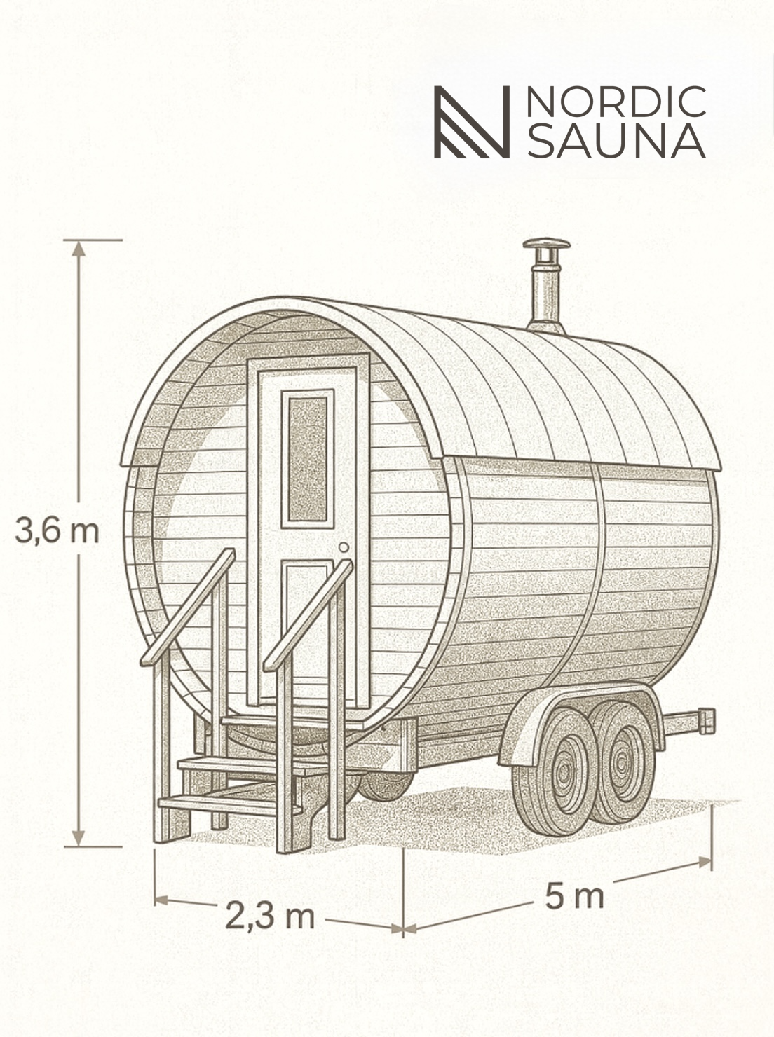 Sauna trailer footprint: 5 m long × 2.3 m wide.